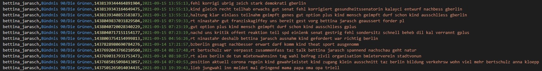 Mit dieser Query erhielt ich über eine cURL-Abfrage eine .csv mit den benötigten Daten, um in einem Python-Skript die Personen einzulesen. Damit konnte ich beginnen, mich um den Download der tatsächlichen Tweets zu kümmern. Nach vielen, vielen Stunden Arbeit (größtenteils wegen Library-Problemen, da viele noch nicht richtig mit der Twitter API Version 2 umgehen konnten) kam ich zu einem halbwegs zufriedenstellenden Ergebnis, welches die Funktion des Daten-Downloads erfüllte. Der größte Nachteil an der Implementierung wie in diesem Ergebnis über Tweepy war – und ist weiterhin – die sehr zeitintensive Ausführung: Für den Download der letzten 200 Tweets von 900 Accounts braucht der Downloader mehr als 21 Stunden. Immerhin ist das Ergebnis sehr lohnenswert: 70.000 Tweets in einer Datei, übersichtlich als Comma-separated values zusammengestellt mit Account-Name und zugehöriger Fraktion.