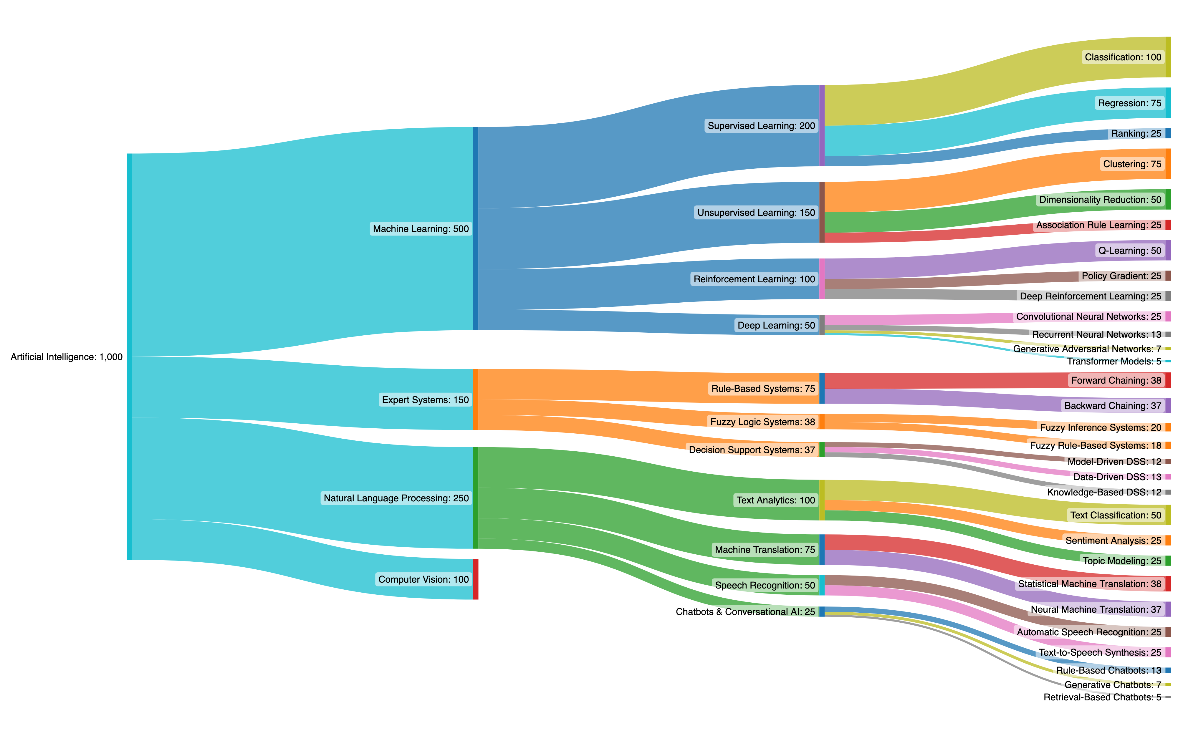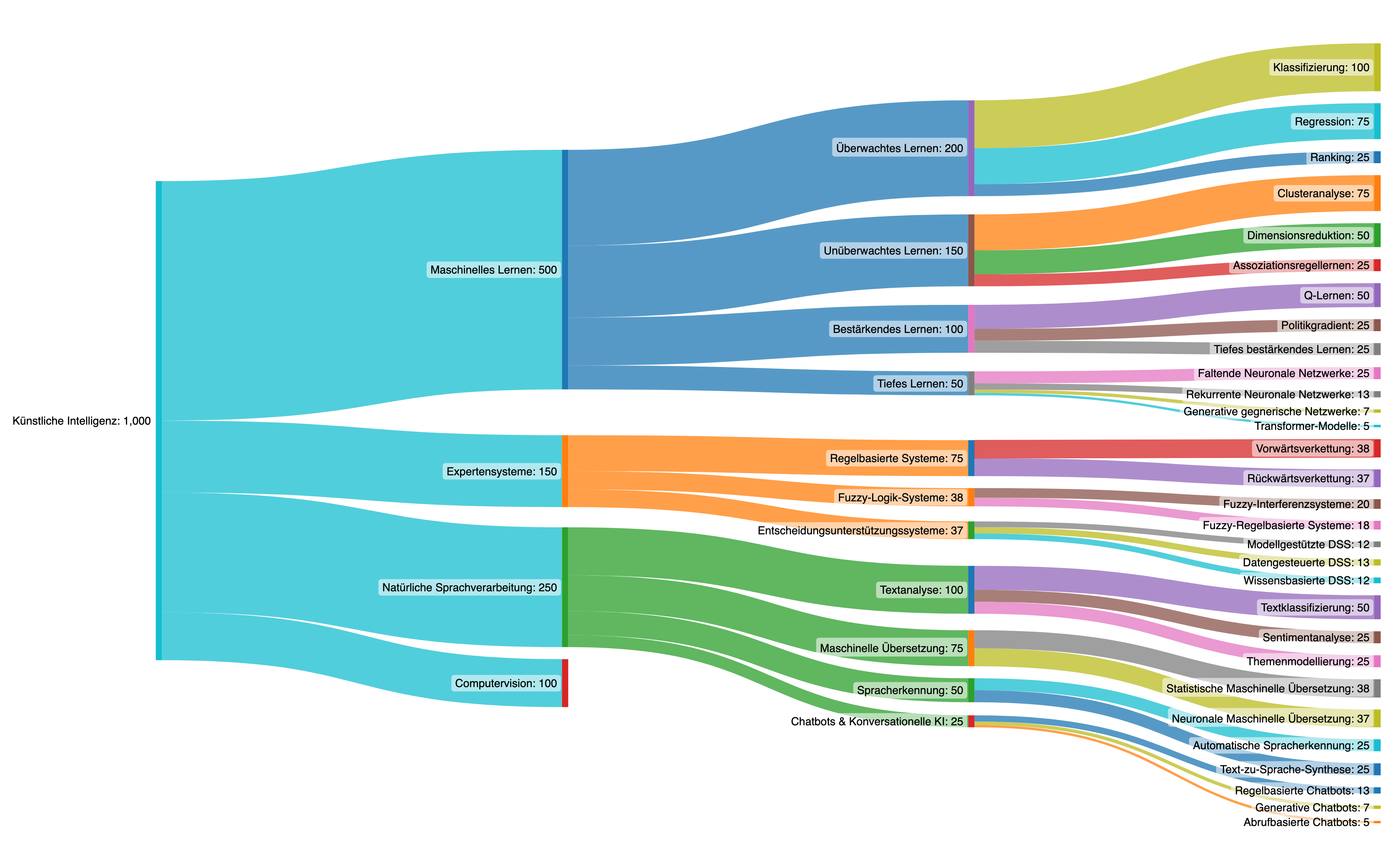 Für viele eher technisch interessierte Personen war der kurze Blick auf das von mir erstellte Sankey-Diagramm zur Übersicht der Themenkomplexe in künstlicher Intelligenz. Mein Ziel war es mit dem Diagramm (welches ich auch auf Englisch veröffentlicht habe, der sich für die Thematik simpleren Sprache) dabei wirklich nur die Übersicht – die Aufteilung, wie viel Gewichtung jedem Thema zukommt, ist praktisch künstlich gewählt und nicht nach harten Daten, da dort die Datenquellen nicht existent sind. Ich habe zwar angefangen, ein Script zu schreiben, welches sich mithilfe von publish-or-perish die Abstracts aller veröffentlichten Studien zu Gemüte führt, um dann eine Gewichtung im Diagramm nach Forschungsrelevanz zu erhalten, doch dies war aus Zeitgründen für eine 30-Sekunden-Slide leider nicht möglich.