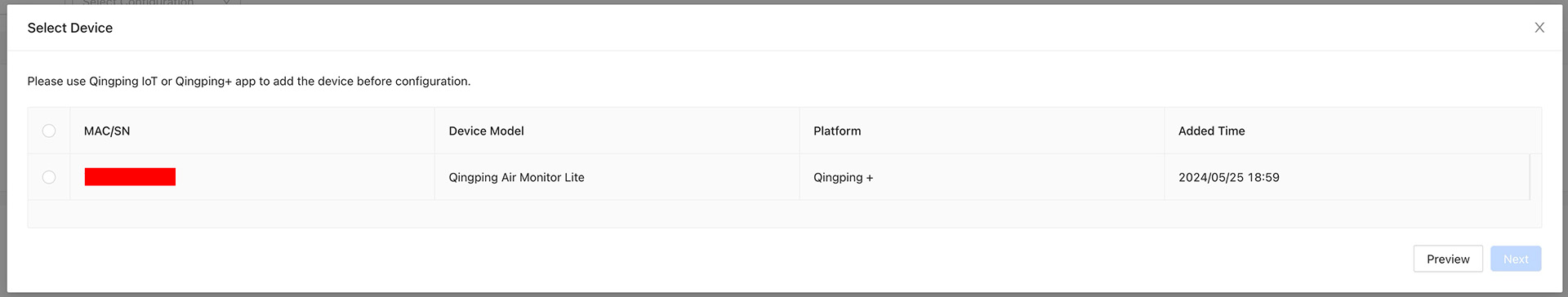 Als nächstes muss man sich mit seinem Qingping-Account bei https://developer.qingping.co/ einloggen. Ob das Gerät richtig hinterlegt wurde, lässt sich bei “Private Access Config” nachschauen, wenn man ein Gerät hinzufügen möchte (Devices in der Sidebar links, dann “add Device). Wenn alles mit dem Hinzufügen geklappt hat, sollte dort das Gerät angezeigt werden: